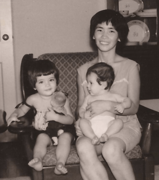 As far as I know, no one was mean to my mom. But she kept a lot to herself, always trying to fit in and look American (I remember her wearing a clothespin on her nose to make it pointed), and dressing up 3 girls to perfection.
